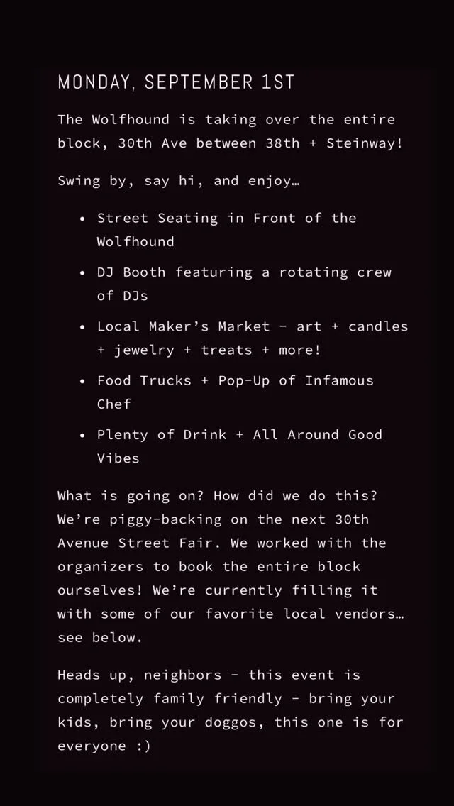 The Wolfhound is a contemporary Irish pub in Astoria Queens NYC. We serve lots of Guinness as well as craft beer + domestic favorites along with seasonal cocktails. We pack the calendar with weekend events - live music, DJ parties, and more. Trivia on Tuesdays. Rocking since August 2016.